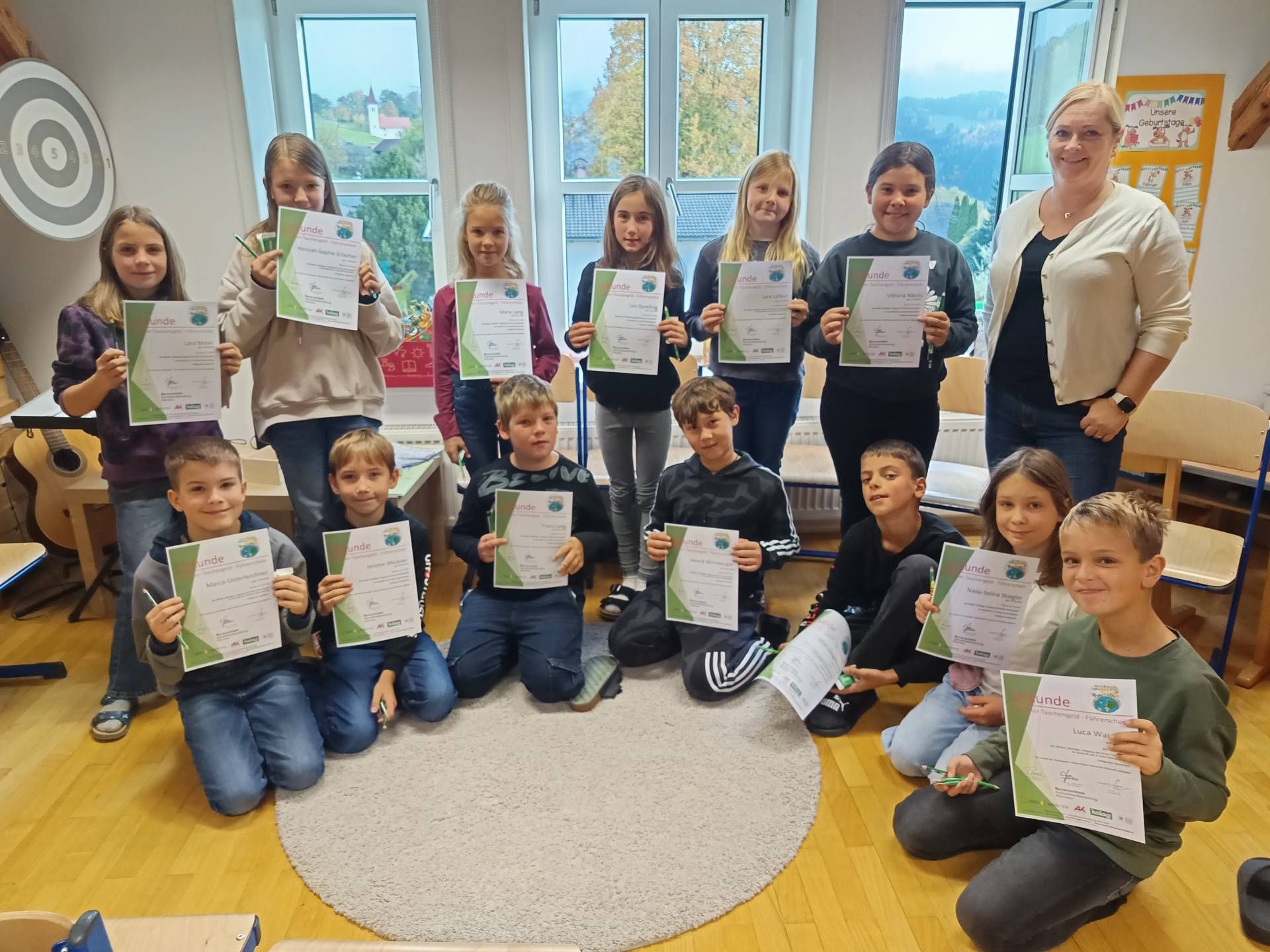In den ersten Schulwochen bereitete sich die 4. Schulstufe sehr intensiv auf die Radfahrprüfung vor. Sie lernten die wichtigsten Verkehrszeichen und Vorrangregeln kennen und welche Rechte und Pflichten sie haben. Nach der bestandenen Theorieprüfung ging eine Polizistin mit den Kindern die Strecke für die praktische Radfahrprüfung ab und gab noch wertvolle Hinweise zum korrekten Verhalten an den Kreuzungen. Nachdem die Kinder mit den Eltern die Strecke mehrmals abgefahren sind und die praktische Prüfung erfolgreich absolviert hatten, konnten alle mit Stolz den ersten „Führerschein2 in Empfang nehmen.