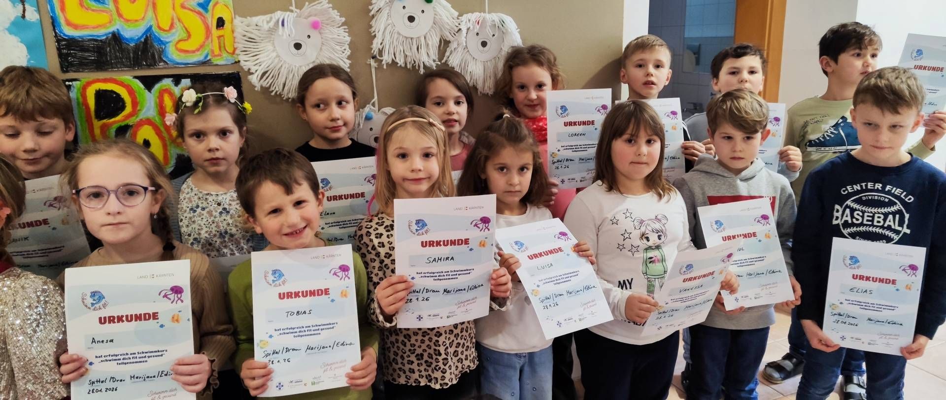 Drei Tage lang waren die Schülerinnen und Schüler der ersten und zweiten Klasse voller Begeisterung in der Drautalperle in Spittal/Drau zu Gast. Zertifizierte Trainer des Schwimmvereins Spittal zeigten den Kindern Übungen zur Verbesserung des Eigenkönnens. Sowohl die Brust-Technik als auch das Rückenschwimmen und das Kraulen wurden geübt und gefestigt. Nach der ersten Übungseinheit stand die verdiente Jause am Programm. So gestärkt, wurde die zweite Einheit mit verschiedenen weiteren Bewegungsaufgaben in Angriff genommen. Am letzten Tag bekamen die Kinder, zu ihrer großen Freude, auch noch eine Urkunde verliehen.