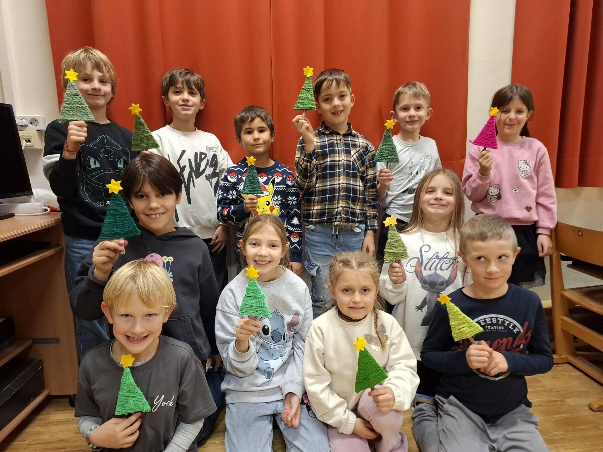Die Schüler:innen der 2. Klassen waren fleißig beim Häkeln von Luftmaschen und es sind wunderschöne Christbäume entstanden.