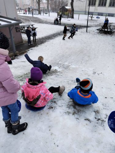 In der Pause hatten die Kinder viel Spaß am Pausenhof beim Rutschen mit den Rutschblättern.