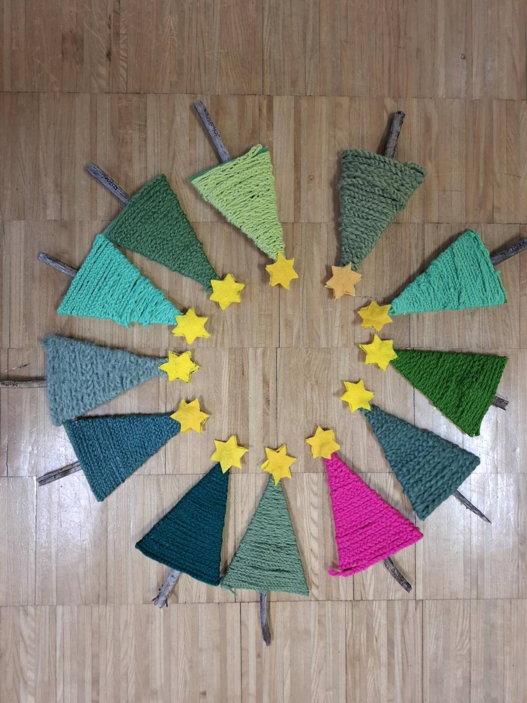 Die Schüler:innen der 2. Klassen waren fleißig beim Häkeln von Luftmaschen und es sind wunderschöne Christbäume entstanden.