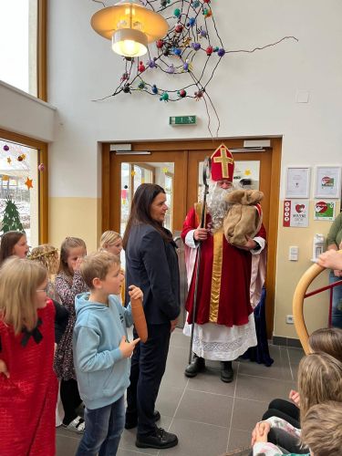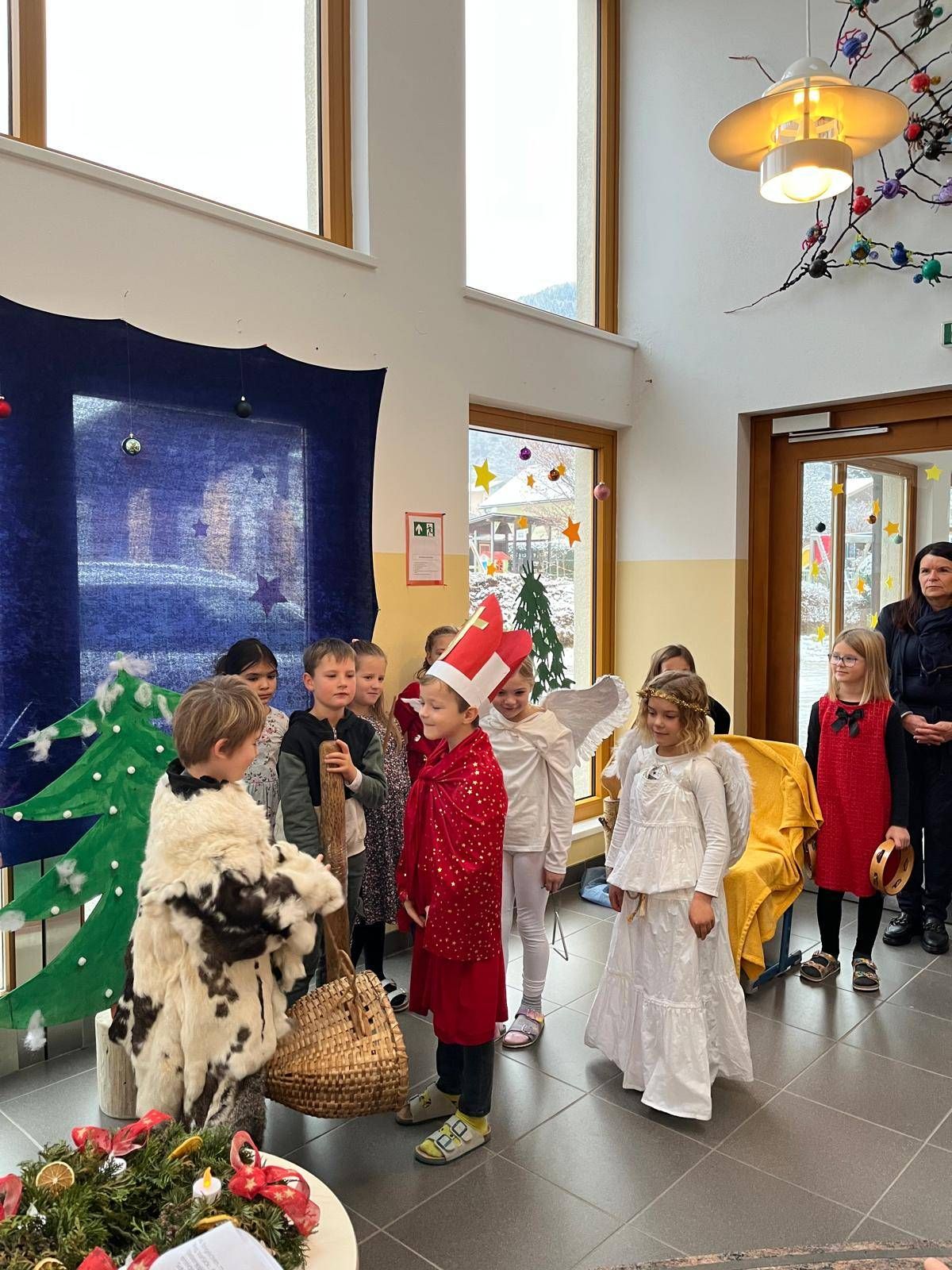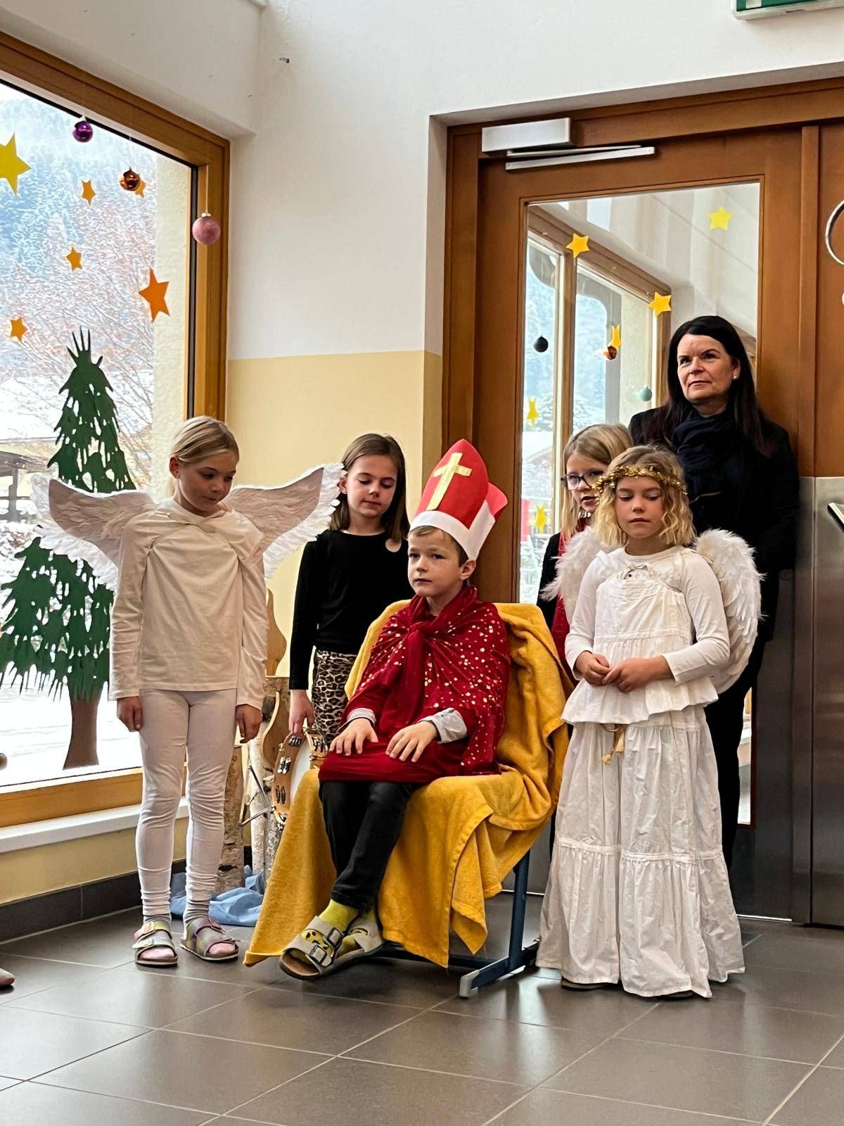 Den besonderen Höhepunkt bildete ein Theaterstück, welches die Kinder der 1. Klasse aufführten. Der Nikolaus lauschte aufmerksam und lobte die Kinder für ihre Darbietungen.