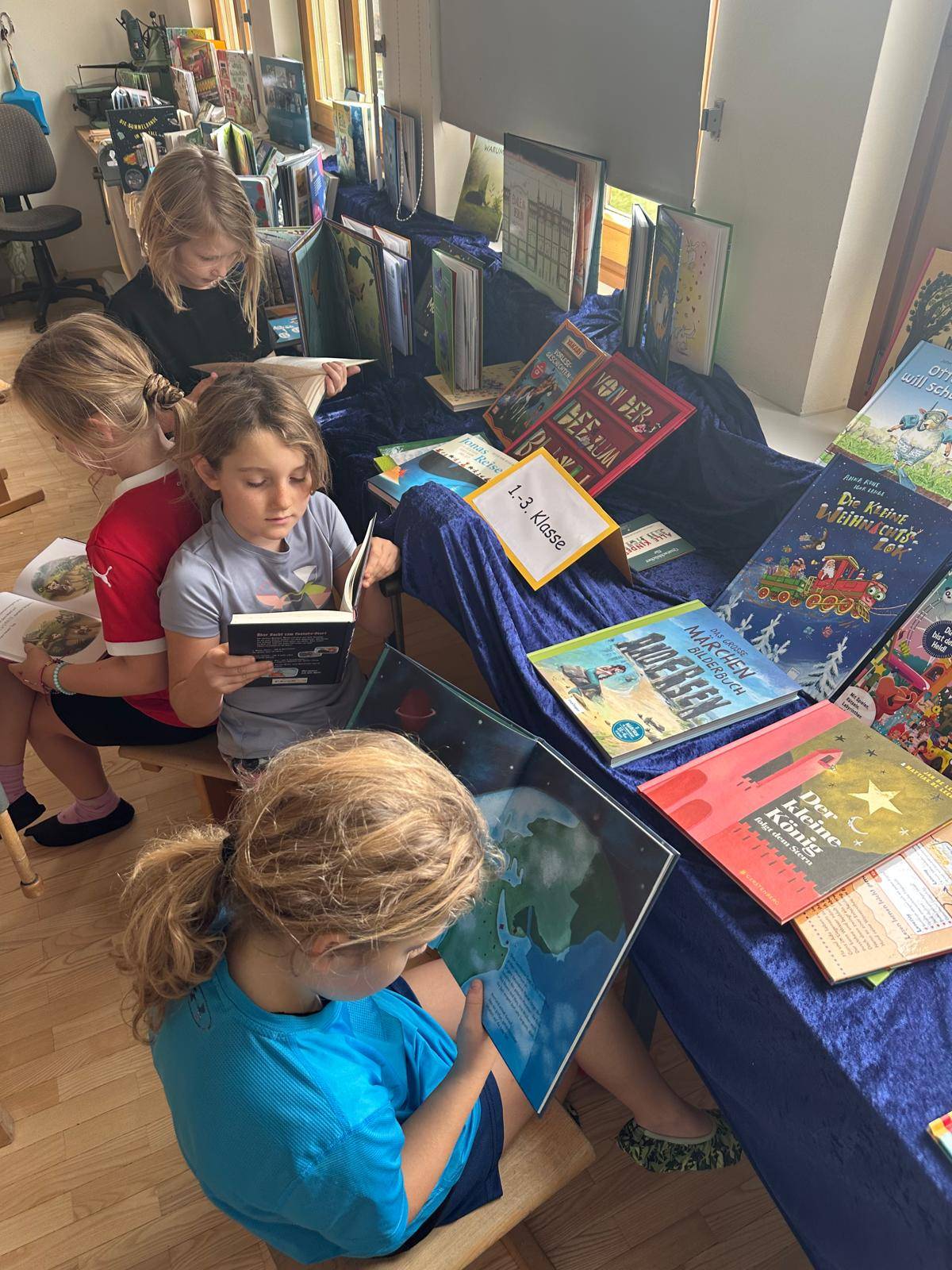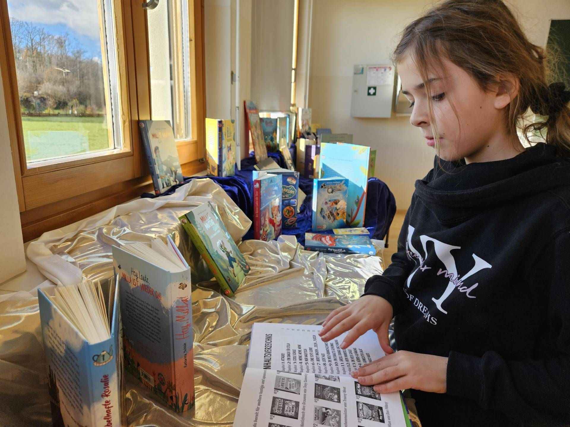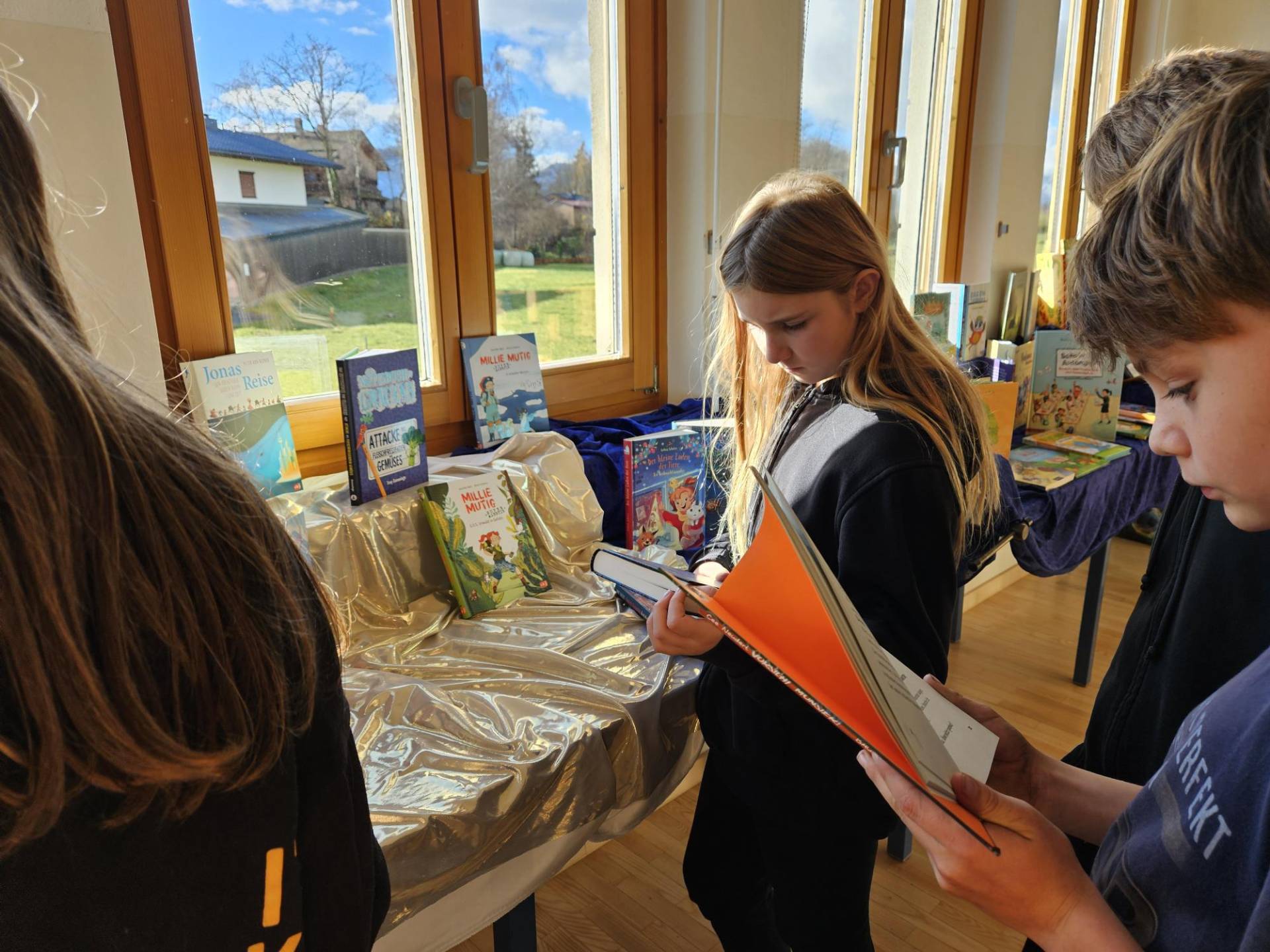 In unserem Schulhaus ist derzeit zum zweiten Mal die Buchausstellung „Lesewelten“ aufgebaut – wie schon im vergangenen Jahr findet sie eine Woche vor dem Sprechtag statt. Unsere Schülerinnen und Schüler stöbern täglich in den bunt gemischten Büchern, entdecken spannende Geschichten, Sachbücher und Bilderbücher und tauschen sich über ihre Leseerlebnisse aus.