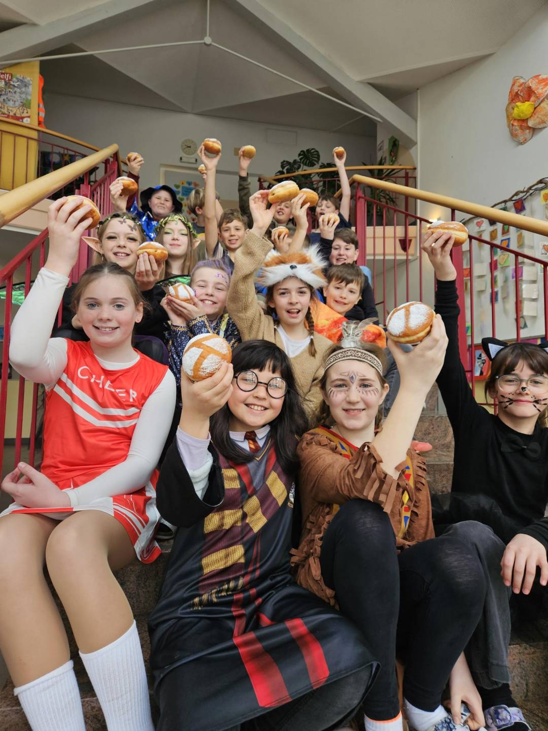 Zum Abschluss wurde im Schulhof noch ordentlich gefeiert: Bei lustigen Gemeinschaftstänzen und mitreißender Partymusik endete ein fröhlicher und unvergesslicher Faschingstag! 🎭🎵