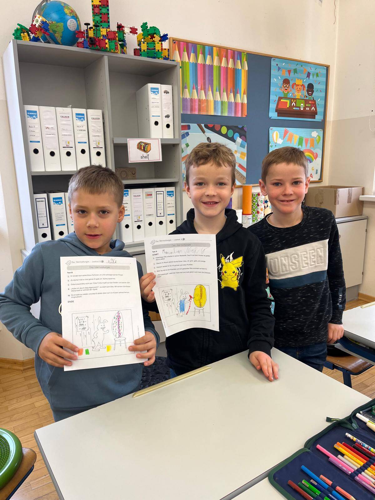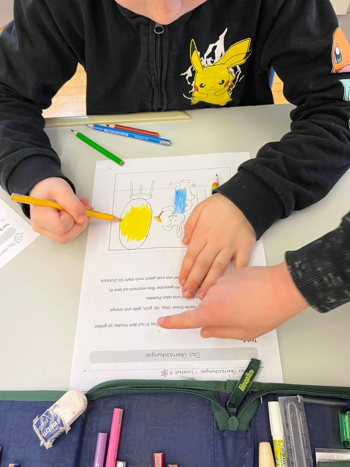 In der Leselauschgeschichte „Das Überraschungsei“ arbeiteten die Kinder in Partnerarbeit nach dem Prinzip der dialogischen Leseförderung. Während ein Schüler vorliest, konzentriert sich der Partner auf das Zuhören und visualisiert den Inhalt durch eine Zeichnung. Dieser Wechsel von auditiver und visuomotorischer Verarbeitung stärkt das Textverständnis, die Aufmerksamkeitsspanne sowie die sprachlich-kognitive Verknüpfung zwischen Hören, Verstehen und bildnerischem Ausdruck. Durch den anschließenden Rollentausch wird das Gelernte vertieft und die Perspektivübernahme gefördert.